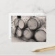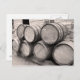 The Wooden Whiskey Barrels Postcard features a rustic photograph of old weathered whisky barrels from pioneer times. A sepia tone has been added to enhance the rustic feel.