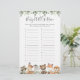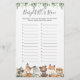 Woodland animals themed baby shower ABC's race game card features a watercolor woodland animals illustration and watercolor greenery eucalyptus garland and elegant handwritten style font.