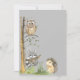 Four cute funny woodland animals ( raccoon,owl, fox,hedgehog) with a tree and foliadge in a light grey background from the woodland animal collection. On the back an owl a racoon and a hedgehog under space for wording.