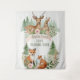 Soft Watercolor Design for a Whimsical Celebration Featuring a Deer, Rabbit and Fox amongst a woodland fir tree background.