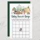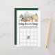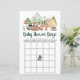 Cute rustic baby shower bingo game featuring an illustration of woodland animals (a bear, fox and raccoon) with their tent and campfire camping in the mountains and forest and "Baby Shower Bingo" in a dark hunter green script.