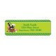 This personalized return address label features a grassy green background bordered by diagonal stripes in two shades of green. Red and white mushrooms and a tree stump with a black and white skunk sits to the left of the template area for you to add your address or other custom text.