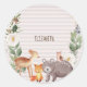 The design features a group of adorable forest friends (deer, bear, raccoon, fox, owl) and lush watercolor greenery.