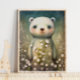 Bring a calm woodland feel to your nursery with this sweet white bear illustration. The bear stands among soft wildflowers with gentle watercolor texture and a cozy storybook look. This nursery wall art works in a baby room, toddler room, or playroom. It pairs well with woodland nursery decor, neutral nurseries, and boho nursery themes. A thoughtful baby shower gift for parents creating a woodland animal gallery wall.