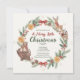 Whimsical Christmas invitation featuring adorable woodland animals including a deer, bear, and penguin arranged in a festive wreath with pine branches, holly, dried oranges, and red berries. Perfect for family-friendly holiday parties and gatherings that celebrate nature's charm with a touch of rustic elegance and playful holiday spirit.