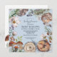 Rustic sweet woodland animals that sleep on the forest floor amongst the foliage, mushrooms and pine needles. A woodland themed boy baby shower watercolor invitation for spring, summer, or fall.