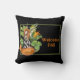 Welcome the Fall season with this whimsical throw pillow featuring watercolor illustrated woodland harvest elf / nymph perched on large pumpkins on black background with customizable orange text
