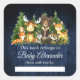 Watercolor Woodland Forest Animals with Pine Trees Baby Shower Bookplate Labels. Baby Animals include Bear, Deer, Moose, Raccoon, Bunny Rabbit, Fox and Owl with forest greenery. Rustic Country Blue Wood Print.