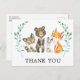 Thank your guests for celebrating the mama to be! This thank you postcard features a watercolor illustration of forest woodland animals surrounded by eucalyptus leaves. Personalize with your information or click "Click to customize further" to edit font styles, size and colours.