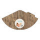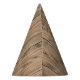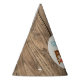 Cute woodland animals birthday party hat featuring a wooden background and four cute woodland animals on an off white circular background.