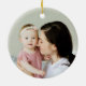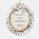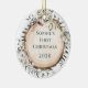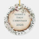 This adorable first Christmas ornament features a watercolor design of a wood slice surrounded by a delicate rose and eucalyptus wreath. The words "XXX's first Christmas" in a sage green all-caps font with the year 2020 below. The back of the ornament has a place for baby's photo