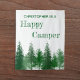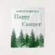 Happy camper birthday with woodland trees in various shades of green