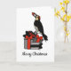 An acorn woodpecker bird sitting on top of a pile of Christmas gifts in red and black colours with fancy ribbons. Text says “Merry Christmas”. A holiday greeting card for any bird lover or anyone growing tired of standard cards and wanting something original.