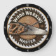 This image displays a round wall clock with a strong woodworking theme, designed to evoke the tools of the trade. The clock face features a central area resembling a circular saw blade, complete with a distressed, textured look and concentric rings. Overlaid on this is a detailed illustration of a vintage hand saw, extending across the face with its sharp blade visible. The outer edge of the clock is a black ring with prominent saw teeth, reinforcing the saw blade motif. The words "WOOD WORKING" are arched above the hand plane, and "MASTER" is below, both in a bold, stylized font. The clock has a black frame and white numbers from 1 to 12. This clock is a perfect piece for a woodworking shop, a dedicated craftsman's space, or as a unique gift for a carpentry enthusiast.