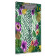 The picture shows a lively mosaic of lush Monstera leaves in lush green and yellow, combined with magnificent purple and orange flowers that stand out against a dynamic, wave-like background. It radiates a wild, tropical energy and a joyful abundance, which awakens curiosity and a natural connection.
