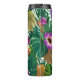 The picture shows a lively mosaic of lush Monstera leaves in lush green and yellow, combined with magnificent purple and orange flowers that stand out against a dynamic, wave-like background. It radiates a wild, tropical energy and a joyful abundance, which awakens curiosity and a natural connection.