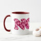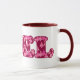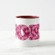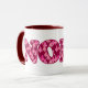 Mug in NOEL word art patterned with Christmas trees - deep burgundy and shades of pink, accented with white