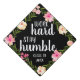 Cute grad cap topper features the quote "work hard, stay humble" in white brush script lettering on a black background adorned with pink watercolor flowers and green foliage. Personalize with your class year.