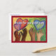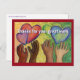 The postcard message notes, "Thanks for your great work." Multi-racial hands reach for colourful rainbow hearts as a celebration of DEI or diversity, equity, and inclusion. Art was made using watercolor followed by pastels on paper.