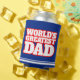 Bold graphic blue, white and red dad can cooler. Reads World's Greatest Dad. Personalize with a photo of you and your Dad on the reverse for a special gift for your father. Ideal for Father's Day, a birthday present, a Christmas Gift or just to show your thanks. Designed by Sarah Trett.
