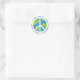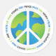 A round sticker with a stylized graphic of the globe, a symbol of our interconnectedness as a global community. Encircling the Earth, a pristine white peace sign and the word Peace in several different languages, a universal emblem of tranquillity sending a message of hope, unity, and the shared yearning for a peaceful world. An original creation by Mango Moon Studio.