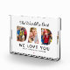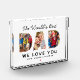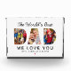 A charming acrylic photo block featuring "The World's Best Dad" in elegant script with "We Love You" and personalized children's names alongside a multi-photo collage. The warm design showcases favorite family moments with heartfelt text. All text and photos are fully customizable. Printed on 1-inch thick Grade A acrylic, this photo block stands on any flat surface — a perfect Father's Day, birthday, or holiday keepsake gift from the kids.