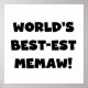 Black text and white text World's Best-est Memaw T-shirts, mugs, hoodies, cards, tote bags, magnets, keepsakes, and other world's best memaw gear. Great gifts for great grandparents!