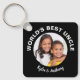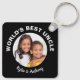 Celebrate the world's best uncle with this custom photo black keychain with white text. Easily personalize with a favourite photograph (crop if necessary to a square orientation with the subjects in the middle before uploading). You can personalize the expression "World's Best Uncle" to something similar in length such as "Best Uncle Ever" or "We Love You Uncle." On the bottom you can add children's names or other text.