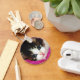 Full colour photograph of a calico kitten with huge blue eyes and against a rich pink background. Perfect for cat lovers, or any animal lover. Irrestistable!