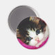 Full colour photograph of a calico kitten with huge blue eyes and against a rich pink background. Perfect for cat lovers, or any animal lover. Irrestistable!
