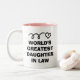 World's Greatest Daughter in Law custom Two-Tone Coffee Mug. Cute cup with hearts and fun typography. Pink or other colour inside.