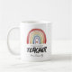 Personalized teacher appreciation mug featuring a watercolor boho rainbow, a red heart, the cute saying 'the world's greatest teacher', and their name.