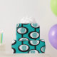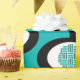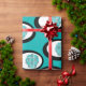 This wrapping paper has a Mid-Century Modern design of lines making circles inside ovals strung together in turquoise, black, and, white.
