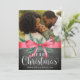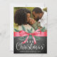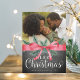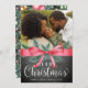 Festive holiday photo card features your favourite images adorned with a red watercolor ribbon bow illustration and green pine boughs. "Merry Christmas" appears beneath in white lettering on a rustic chalkboard background. Personalize with your names and the year.