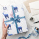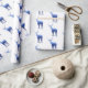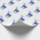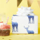 This gift wrapping paper is shown in white with a heard of blue elk/deer with their antlers. repetitive print.