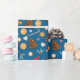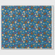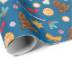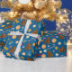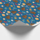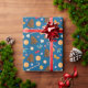 Wrapping Paper with a New Year's pattern, cute pictures of candies, lollipops and gingerbread cookies, bows and leaves on a blue background.