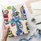 Santas, Santas, everywhere and where’s a gift for you? Each Santa wears a different colour to match a favourite colour of someone special. Notice the trains, lights and stuffed animals?