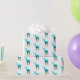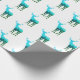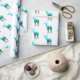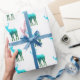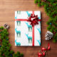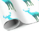 This gift wrapping paper is shown in white with a heard of blue to green elk/deer with their antlers. repetitive print.
