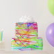 Like undulating ribbons in neon greens and purples; electric blues and aquas; hot pinks and reds; fluorescent oranges and yellows -- all transparent and twisting and overlapping in a pattern reminiscent of beams from multicolored lasers. This stunning design is an excellent choice for birthdays or for a host/hostess gift presentation on New Year's Eve.