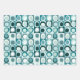 wrapping paper in repeating pattern of abstract squares and blobs in solid colours teal blue magenta