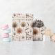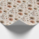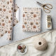 "Wrapping paper with a delicate botanical pattern featuring beige and brown flowers, branches, and leaves, displayed both unrolled and flat."