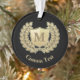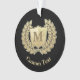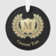 Wreath and shield icon. Custom background colour. Custom monogram. Custom text on both sides.