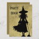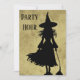 Witch with her broom silhouette on a hazy background ready for a party. Use for Halloween bash, birthday, or even a witches bachelorette invitation.