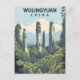 Discover the breathtaking landscapes of China with this stunning Wulingyuan China travel postcard! This captivating illustrated design features the iconic tall sandstone pillars that define the Wulingyuan Scenic and Historic Interest Area, often referred to as the 'Avatar Mountains.' The stylized art beautifully captures these unique geological formations rising from a lush, misty forest, evoking a sense of wonder.