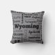 A charming throw pillow featuring the state of Wyoming and some of its cities in black text with varying fonts and sizes on a grey background on the front, and black on the back.