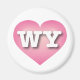This magnet features a cool pink heart with a white-washed centre containing the bold white upper-case letters WY, the official abbreviation for Wyoming, the equality state.