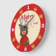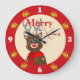 Embrace the festive spirit with this colourful clock featuring joyful reindeer, red backgrounds, and the phrase "Merry X-mas" in maroon. Showcasing clear Hindu-Arabic numerals and bells for easy reading.
