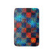 Xadrez com riscos cruzados, de cor azul escuro e riscos em azul claro e laranja com tons manchados avermelhados, e bordas escuras nos traços que podem causar a percepção de sujo ou manchado.
