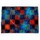Xadrez com riscos cruzados, de cor azul escuro e riscos em azul claro e laranja com tons manchados avermelhados, e, bordas escuras nos traços que podem causar a percepção de sujo ou manchado.