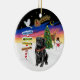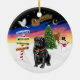 A black Pug watches Santa take off in front of the North Pole’s signs that say Take off, Village, Workshop, and Barracks. A reindeer peeks out from behind a festive Christmas tree next to a happy snowman.